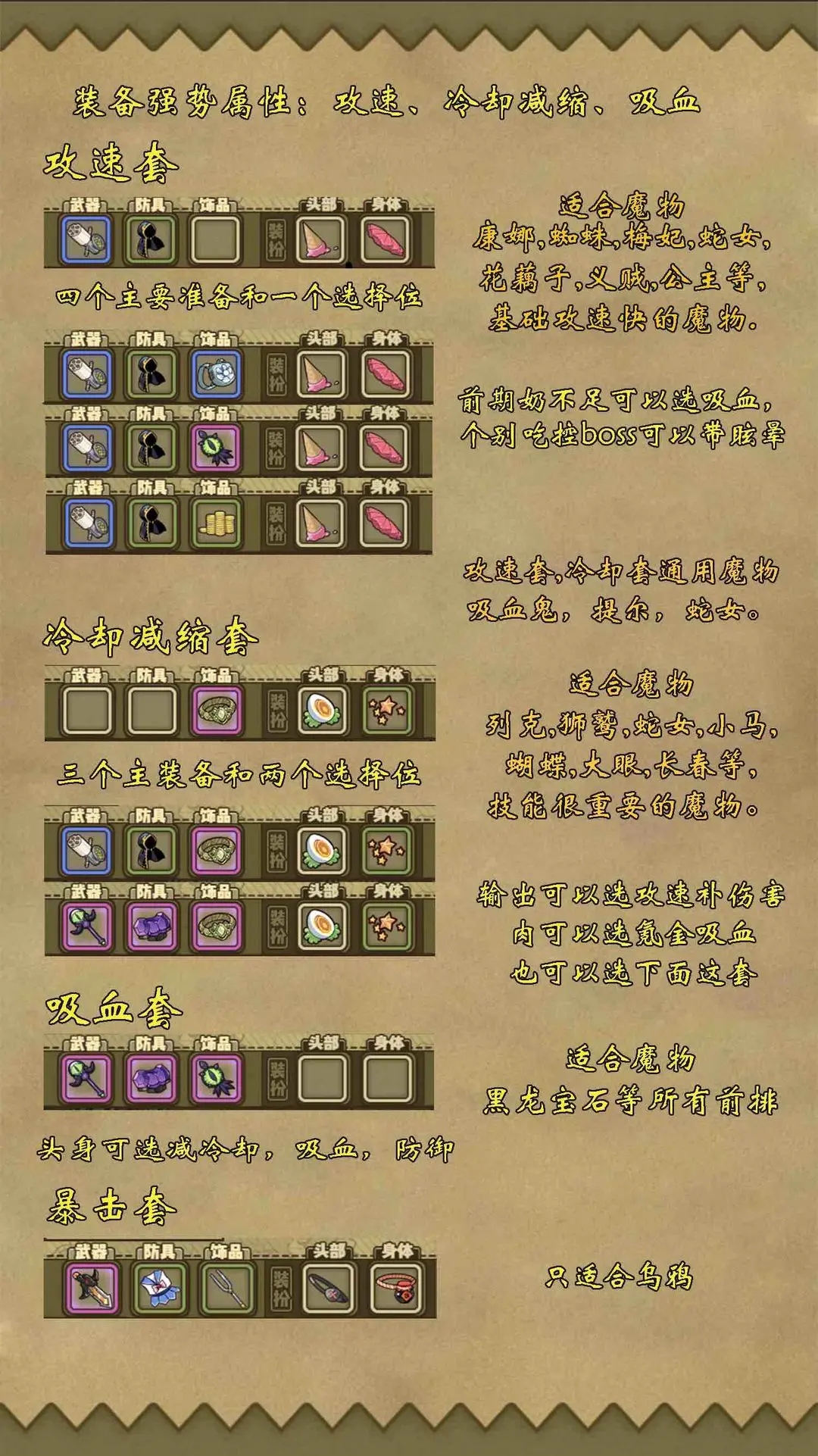 一、萌新最实用的就是攻速吸血冷却这三套,其中吸血有时候能扭转战局,奶不足的时候上有奇效。