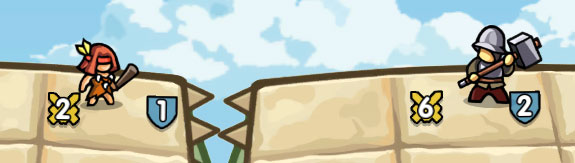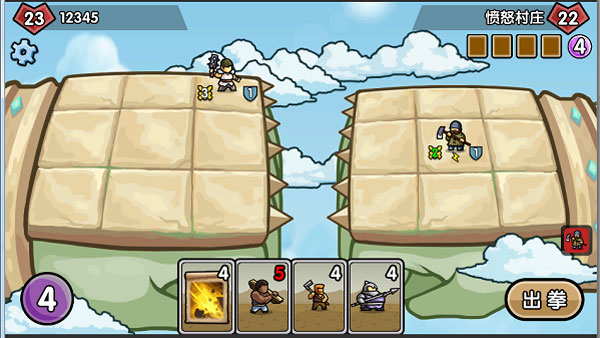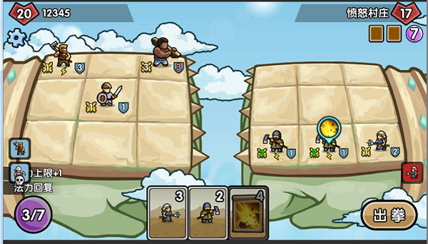 回合中,双方都在同一横排出场一个角色,如果在一轮攻击之后,己方角色存活,对方角色死亡。那么场面上本方就多了一名角色。(战斗规则:每个角色,每回合只攻击一次,攻击横排最靠前的敌人,若角色攻击时本横排不存在敌方角色,则攻击玩家)