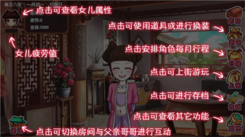 这里会有玩法教程,点击背包可使用道具或进行换装;点击日常可以安排角色每月行程;点击上街可上街游玩;点击存档可进行存档;点击其他可查看其它功能;点击房间可切换房间与父亲哥哥进行互动;