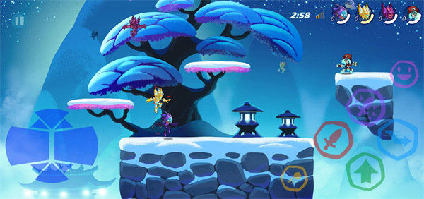 游戏的按键也非常有意思,左侧是控制角色移动,右侧紫色的是重击、蓝色的是躲闪/冲击、粉色的是表情、红色的是快速攻击、黄色的是投掷物品、绿色的就是跳跃,整个游戏操作非常简单,感兴趣的小伙伴快来下载体验一番吧。