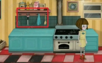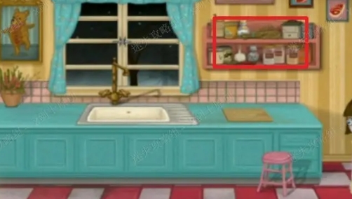 接着向左走,点击架子在架子上找到,在架子上的盒子当中拿到三个非常重要的调料。
