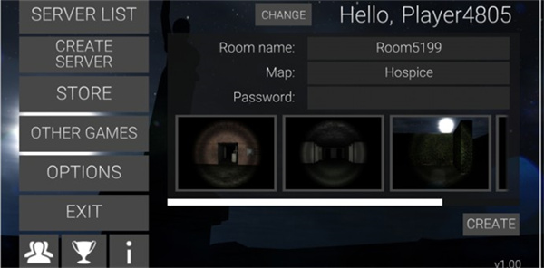 游戏界面显示的第一个是房间大厅,第二个是创建房间,第三个是道具购买,其他可以不管。