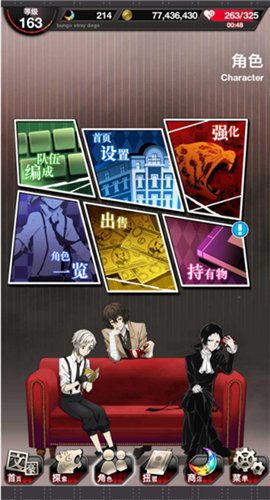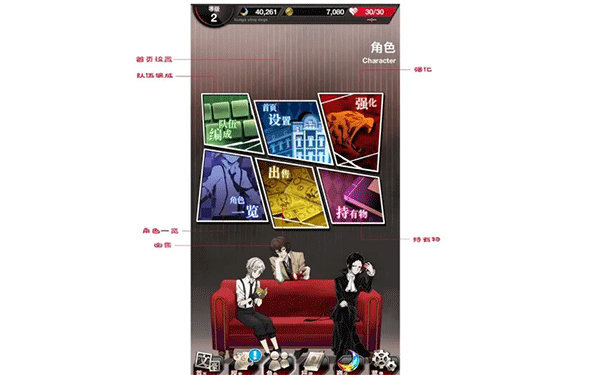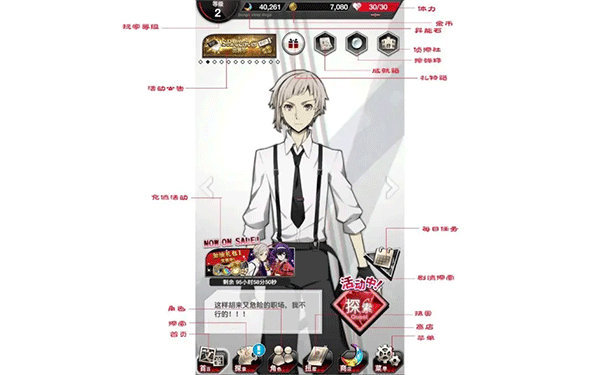 侦探社:在侦探社里每隔一段时间可以从对应角色处领取奖励,可用素材或异能石强化侦探社内的角色工作环境,以缩短等待时间及提高奖励等级。