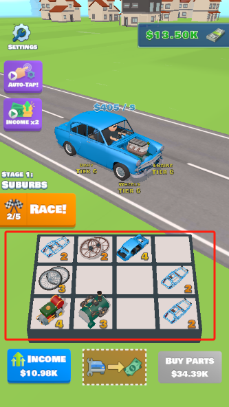 合并 赛车 是一款 放置 休闲 类型的游戏,玩家在游戏中能够购置零件以 升级 自己的赛车,利用低等级的零件进行两两 合成 更高等级的零件,并且持续 点击 屏幕使赛车赚取金钱,用于提升自身部件,还可以直接与其他玩家 对战 赢取金钱,感兴趣的玩家快来 下载 吧!