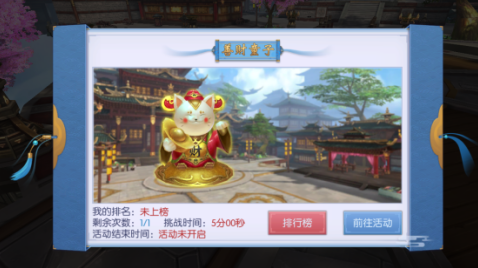 善财童子:该活动一天有一次 挑战 机会,每次持续五分钟,只要攻击地图中飞速奔跑的善财童子就可以获得灵石,除了攻击可获得灵石外,还会根据获取灵石排名,进行奖励发放。