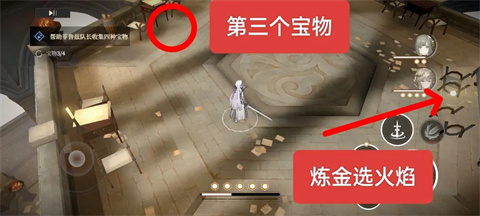 找四个宝物按着光点点完两个,然后去升降台到上层左边拿了第三个宝物再去右边炼金台选择火焰。任务完成!