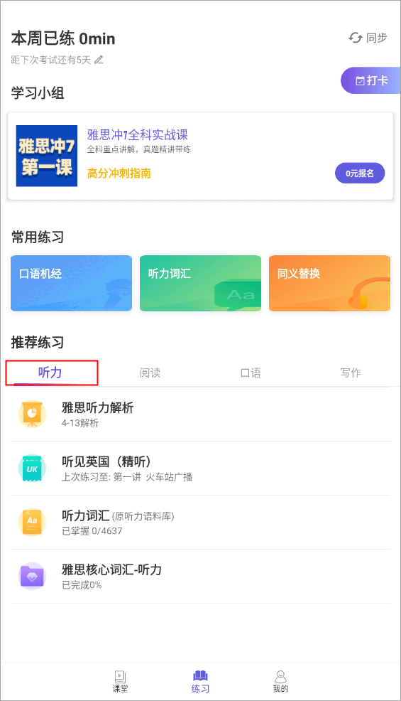 1、进到软件后,还是在练习界面,我们在下方可以看到有个“推荐练习”版块,在听力版块内可以看到有雅思听力解析、听见英国、听力词汇、亚次核心词汇-听力。