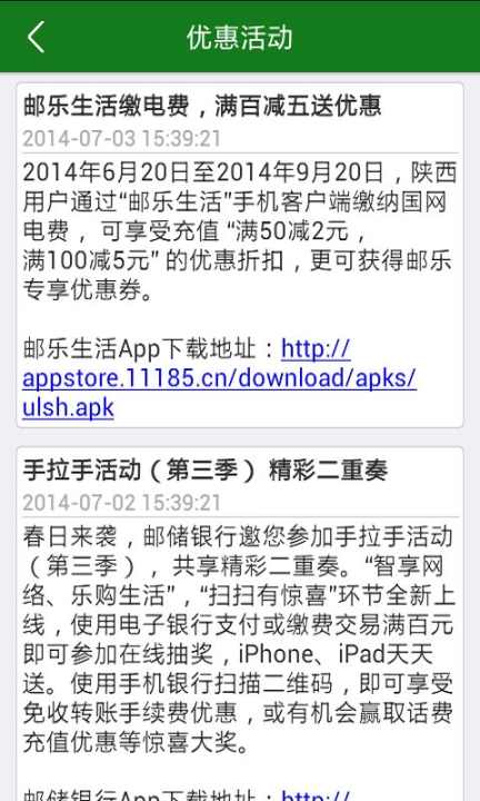 2、这里能够直接进入邮政储蓄,非常方便,直接在线上办理相关业务。1、这里能够随时查看到各种邮局的促销信息,可以随时享受优惠活动;