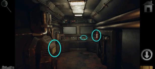 6、退回到有地图的那个房间,根据屏闪依次点击门上的按键(343231),进入仓库后拿走右边的「千斤顶」和「钥匙」,观察海报然后到火车那里用千斤顶撬开火车门。