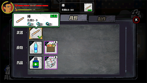 3、点击背包可以装备武器和使用食物和药品。