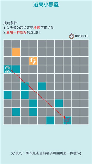 4、你需要通过点击蓝色的格子来到门口。此时只能选择蓝色的格子,并且要每一个蓝色格子都要点击到,点击后会显示橙色。