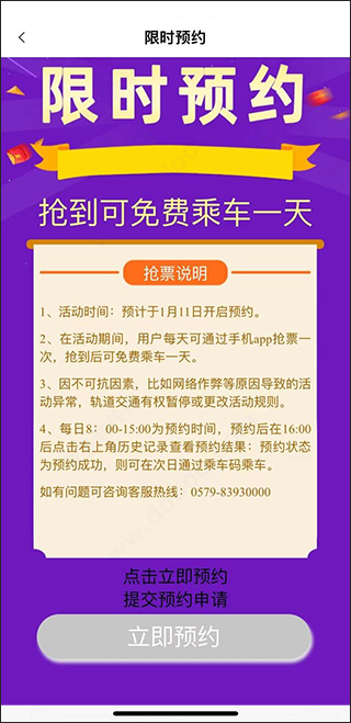 打开APP首页,在每日早上8:00到15:00之间点击“免费试乘,限量预约”广告栏,进入预约网页,可点击“立即预约”提交次日运营时间内的免费车票的预约申请。每日15:00后将在所有提交预约的乘客中抽取指定数量的人员,发放次日免费车票,结果将在16:00之后在此界面显示。