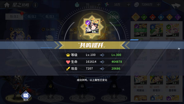 开启【星之共鸣】后,还能通过共鸣,一键拉满新角色,(共鸣角色无需升级即可获得核心队伍中等级最低者的等级)大大节省培养成本,配队更自由!
