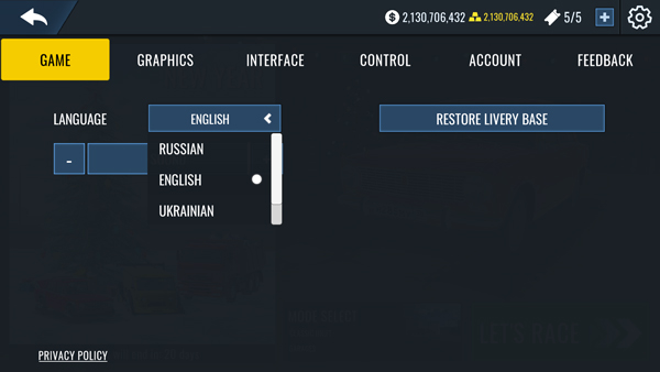 2、在游戏界面的右上角找到设置按钮并点击,随后点击“LANGUAGE”选项,就能实现语言切换,可选择的语言包括俄文、英文等。