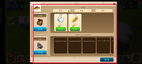 点击右下方的小马,就可以将仓库中的商品进行出售了,只要选择商品并点击添加,最后点击出发就可以了。