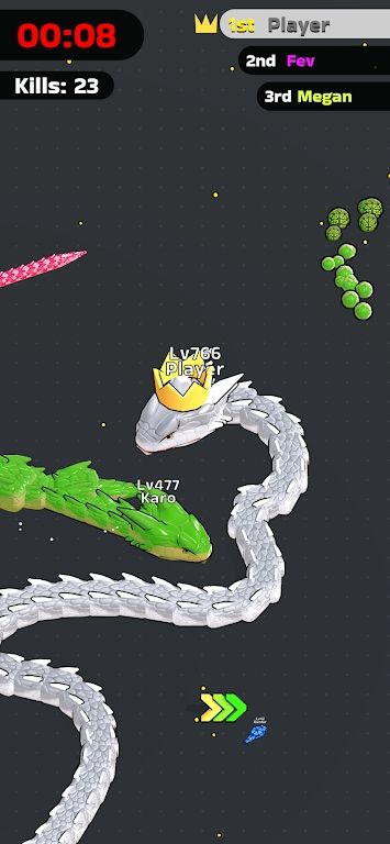 3.玩家需要灵活地躲避其他蛇的攻击,同时找到机会吞噬对手,以增加自己的长度和得分。1. 这款游戏的目标,是在竞技场上存活下来并成长为最长的蛇,玩家能获得相当不错的战斗体验。