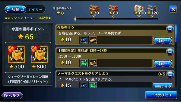 上图是任务界面,从以前的每个人物都有自己的水晶奖励,变成了集合在一起的模式。按照活跃点来领取。想到120很轻松。左侧则是周活跃。