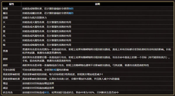 拥有基本特性的技能过多,所以不进行类型总结,仅在此说明各个基本特性的效果。