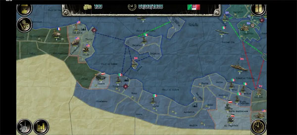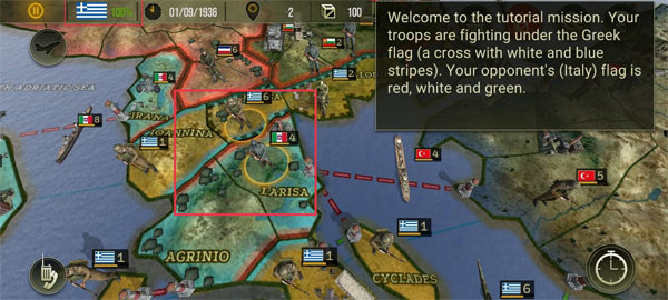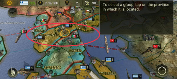 1、游戏的开始你的军队将会在希腊国旗(一个蓝白相间的十字)下作战条纹),而你的对手则是(意大利)的旗帜是红白绿三色。