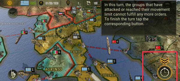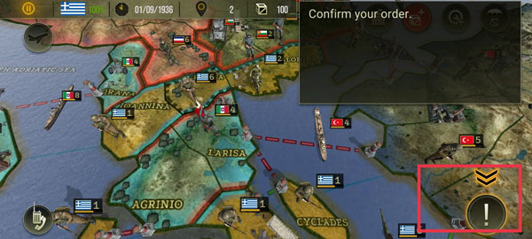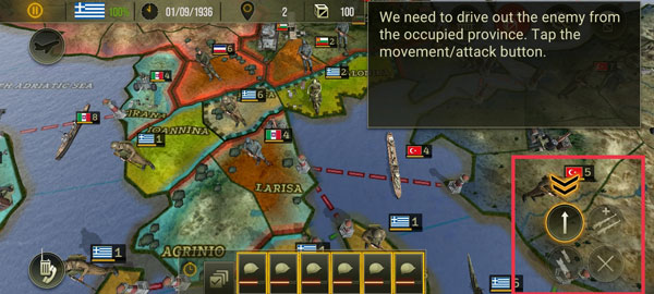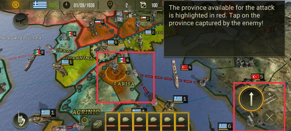 4、当板块周围出现了红色的线条,就表示可以进行攻击,点击敌人占领的区域,然后让周围的军队去支援正在打仗的地方。并且指定要攻击的敌军单位之后,我们还需要再次点击右下角按钮来确认命令。