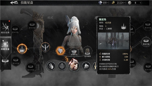 这个角色的技能大体可分为两类,即远程武器技能与近程武器技能。在远程技能方面,多数属于定点攻击,不仅耐力消耗极少,冷却时间也很短,然而其伤害相对不高,主要侧重于范围攻击与远程伤害。当然,这类技能连续释放时场面颇为壮观,能看到诸多粒子特效在空中四处飞舞,具有不错的观赏性。