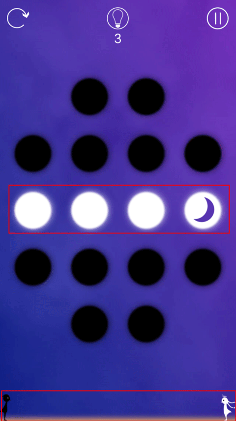 带有月亮的光圈是我们开始的地方,连接上下左右方向的光圈就可以改变它们现有的颜色,当屏幕上所有的都变为同一种颜色,无论是黑还是白都意味着同一个世界的产生。