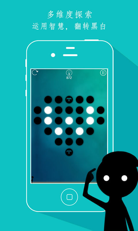 虽然人设风格类似,但《同一个世界》却不是如大家所猜想的解谜冒险游戏,而是益智~玩家所要做的就是将画面的黑白光圈归于同一种类型,如此便可让男女主角跨过界限再次相见。带有月亮的光圈是我们开始的地方,连接上下左右方向的光圈就可以改变它们现有的颜色,当屏幕上所有的都变为同一种颜色,无论是黑还是白都意味着同一个世界的产生,这或许就是本作定名的意义吧。