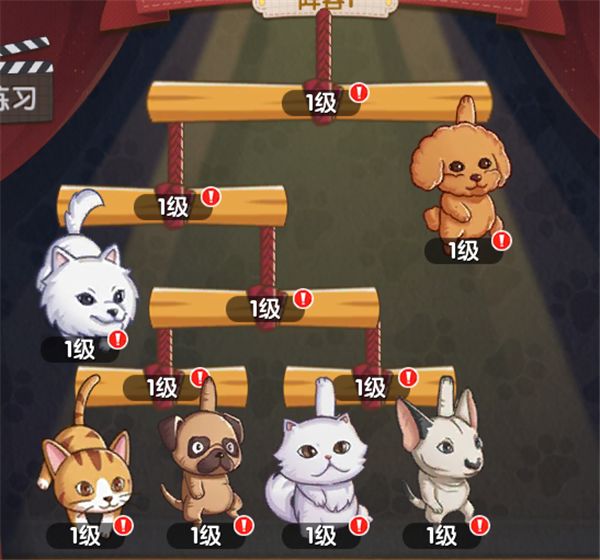 3、而当对方使用下面这种阵型的时候,割绳其实是相对困难的。因为上方有一只动物挡住了割绳的路线,无法直接对他们造成团灭的伤害。这时我们可以选用一些带有穿透技能的动物去进攻,例如:柯基、日本田园猫等,来增加容错率。