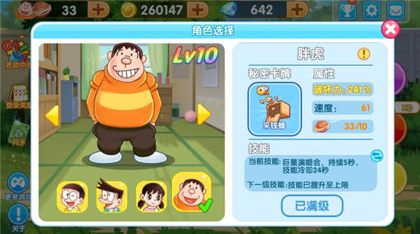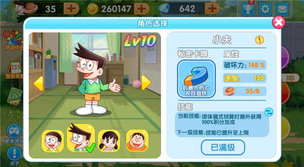 3、游戏中的每个角色都拥有独特的技能,您可以在人物介绍里查看这些技能,比如大雄的技能是主角光环,使用后在死亡时可以复活一次并进行一段时间的冲刺。