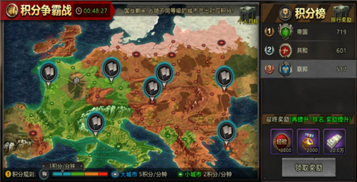 这个国战项目开始后,地图上会随机出现七个带旗子图标的城池,以当下阵营占城数量和质量开始积分,小城市2积分/分钟;大城市5积分/分钟,带旗子的城市积分随时间变化如下: