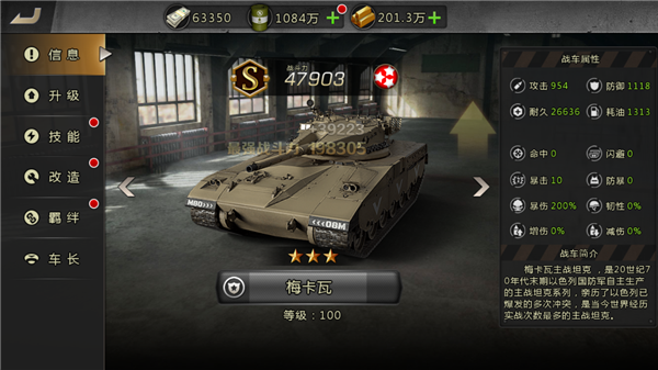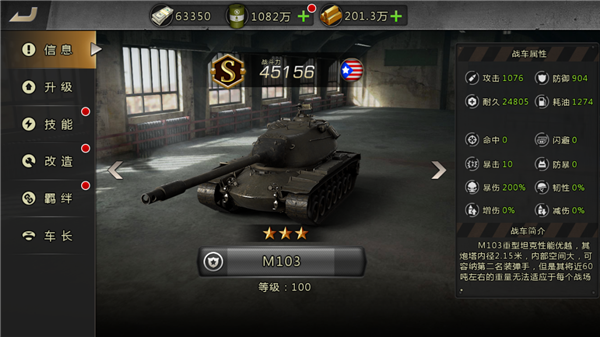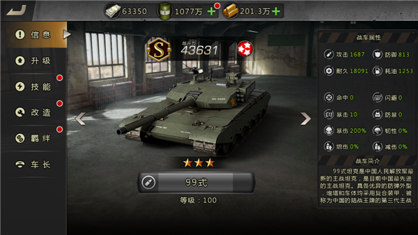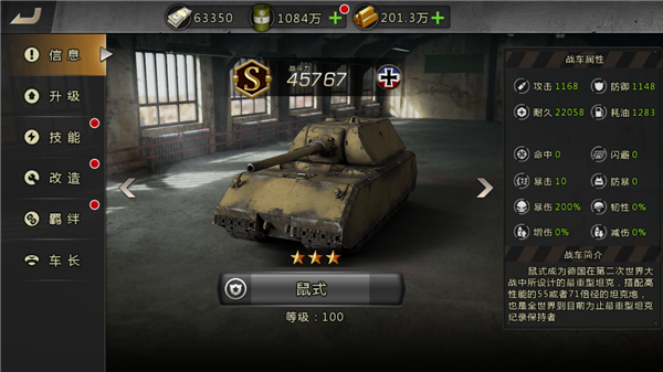 主战炮:发射主战炮,对敌军前排造成200%+200伤害并降低10%防御和免伤,持续6秒