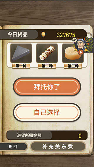 通过菜单的“进货”可以为小店进货。勾选所需要进的关东煮,点击“补充”即可。通过进货不同的关东煮可以控制来的客人是谁。