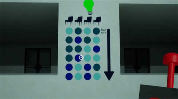 3、玩家需要依次点亮桌上的灯泡,根据桌子周围不同颜色的椅子,对照墙面相应颜色来点亮即可。