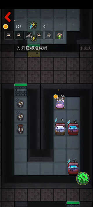 升级优先度:找好宿舍后优先提升床的等级和建造两个炮台,因为这个时候勐鬼还没有到来,所以优先提升床铺的等级快速获取金币,然后再去提升门的等级,之后床铺的等级可以暂停一下,优先提升门的等级,否则很容易被勐鬼突破,提升到需要电力的时候再去商店购买游戏机,否则会很容易被勐鬼突破;