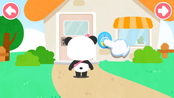 在场景开始之后,小熊会去朋友家拜访,先让宝宝点击门铃敲门,等待企鹅朋友开门即可。