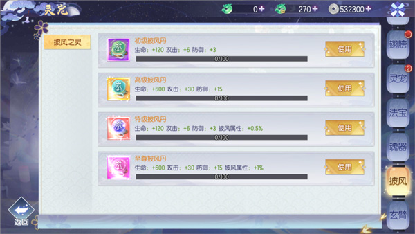 法宝需要消耗法宝进阶石来进阶,满阶后拥有毁天灭地的功效,驱魔伏妖不在话下,但同样会耗费大量的法宝进阶石拉进行培养。