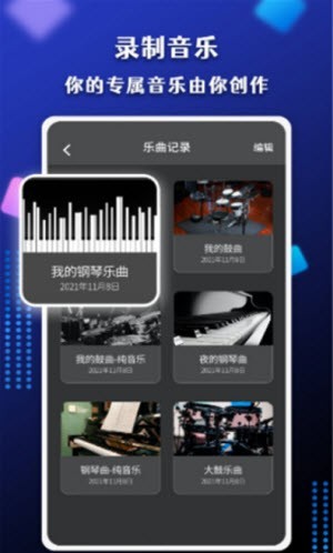 支持钢琴全键盘,支持架子鼓全界面,为了更好的体现乐队的功能,扩展到了键盘、架子鼓并且带有多音轨录音功能,全部乐器声音都来自于真实乐器。