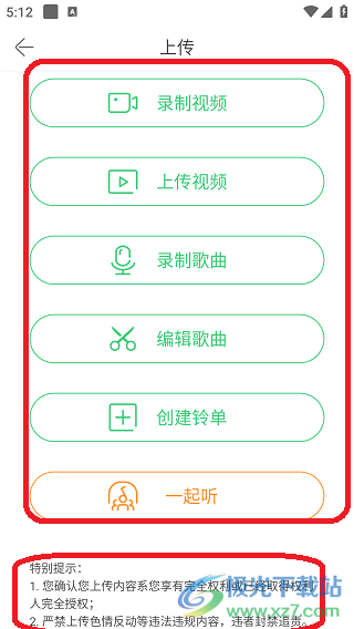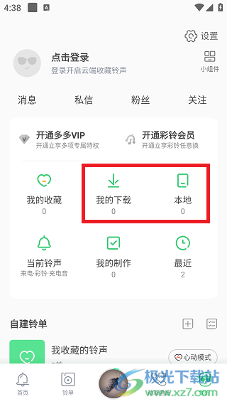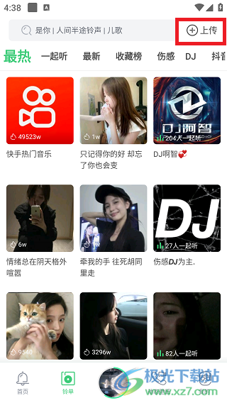 1、来到页面点击铃声,点击右上角上传进入;