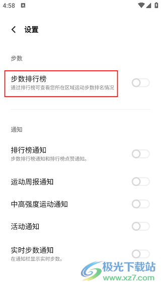 3、点击一次即可进入“设置”窗口,随后在其中寻找“步数排行榜”选项,最后点击该选项右方的开关按钮来将其关闭。