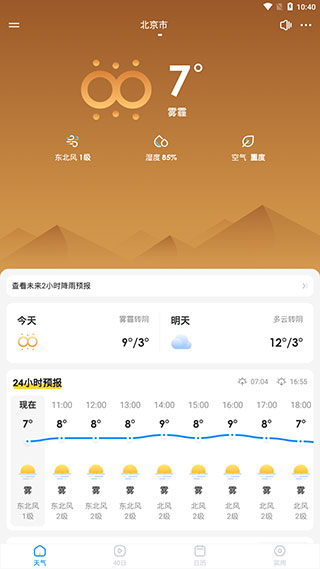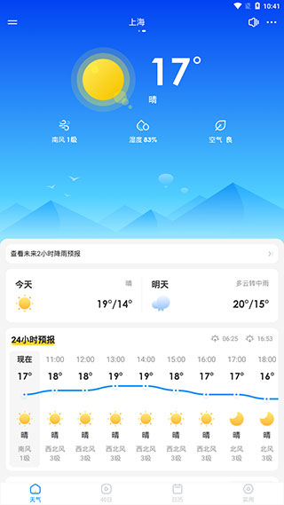 进入幸福天气预报软件,顶部展示当日天气,底部则展示24小时内的天气预测。
