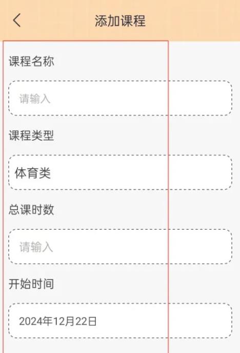 在添加课程页面,输入课程名称、选择课程类型、总课时数、开始时间等