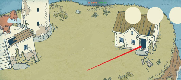 1、首先玩家们可以进入游戏场景右侧的小木屋中(下图的红色箭头所指的区域)