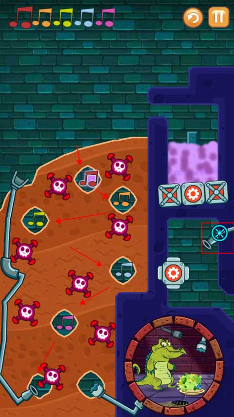 在第二关中,你需要按照正确的顺序将被污染的水流导入每个音符,并且要小心避开炸弹的爆炸。同时,也要确保小鳄鱼有足够的水来洗澡。