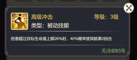 点评:触发挑衅可以强制让对方进行普攻,提供一定的控场能力,相比【冲击】虽然概率较低,但没有触发条件,适合配合拥有范围伤害技能的坦克或者辅助类英雄使用。