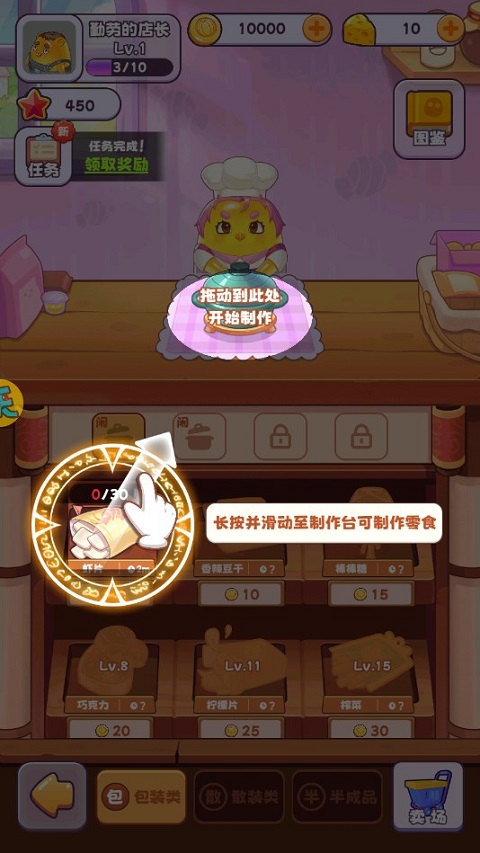 返回“制作”界面,长按并滑动材料至制作台即可制作零食。