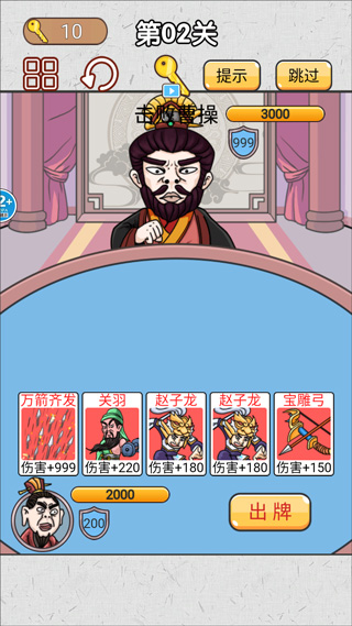 无双三国城市闯关是一款以三国为背景的卡牌策略游戏,Q版的角色设计和充满幽默感的元素让玩家体验到独特的游戏乐趣。游戏以其滑稽的风格和荒诞不经的难题考验玩家的智慧,同时通过各种梗来挑战玩家的认知,避免被一些出人意料的操作惊到。玩家可以通过手中的卡牌进行战斗,完成一系列刺激的挑战,感受三国对战的独特魅力。卡牌的合成与组合需要玩家的创造力,你可以自由探索,每张卡牌在关卡中都有其独特的作用,合理运用它们可以让挑战变得更加轻松。不同的卡牌效果可以组合成强大的攻击,玩家可以根据自己的牌组,发挥无限创意,挑战关卡中的强大敌人,非常有趣。