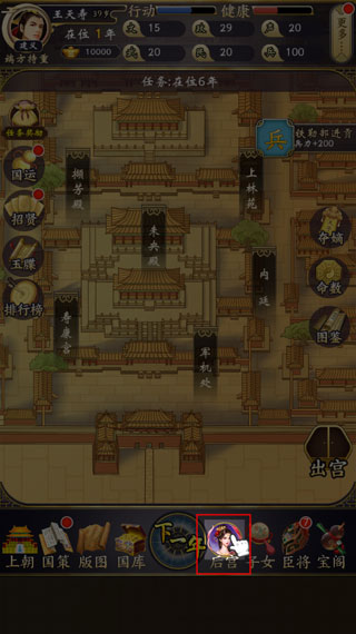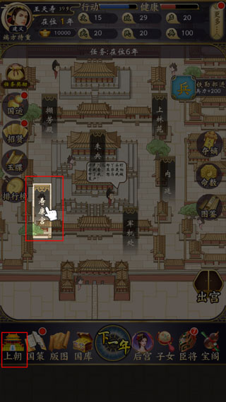 首先进行朝堂事务,随意点击兵部、礼部等提交奏章,依据选择来获得或损失声望、政务。